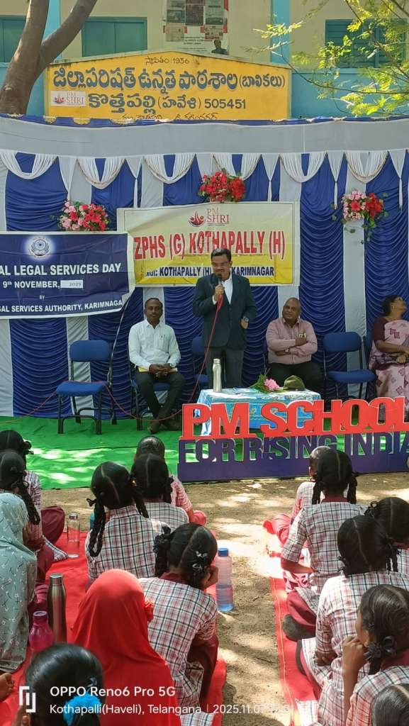 జాతీయ న్యాయ సేవాధికార సంస్థ దినోత్సవం సందర్భంగా జిల్లా న్యాయ సేవాధికార సంస్థ సెక్రెటరీ మరియు సీనియర్ సివిల్ జడ్జి కే వెంకటేష్ ఆధ్వర్యంలో కొత్తపల్లి (హ) లోని ప్రభుత్వ ఉన్నత పాఠశాల లో న్యాయ విజ్ఞాన సదస్సు నిర్వహించారు ఈ కార్యక్రమంలో విద్యార్థులకు రాజ్యాంగము కల్పించిన హక్కులు మరియు భద్రత కోసం కల్పించిన చట్టాల గురించి వివరించారు, జాతీయ న్యాయ సేవల టోల్ ఫ్రీ నెంబర్ 15100, మాదక ద్రవ్యాల నిరోధక, మరియు సైబర్ క్రైమ్ టోల్ ఫ్రీ నెంబర్స్ తప్పకుండా గుర్తుంచుకోవాలని తెలియజేశారు ఈ సందర్భంగా బాలికలు అన్ని పరిస్థితులలో ధైర్యంగా ఉండాలని ఏదైనా సమస్య తలెత్తితే తల్లిదండ్రులకు గాని ఉపాధ్యాయులకు గాని లేదా న్యాయ సేవా అధికార సంస్థ యొక్క టోల్ ఫ్రీ నెంబర్ కి గాని తెలియజేయాలని సూచించారు. విద్యార్థులు చట్టాలపై అవగాహన కలిగి ఉండాలని అని,చెడు కోసము మొబైల్ వాడడం వలన ఎదుర్కోవలసిన దుష్పరిణామాలను వివరించారు, ఈ కార్యక్రమంలో లో న్యాయమూర్తితో పాటు లీగల్ ఏడ్ డిఫెన్స్ కౌన్సిల్ తణుకు మహేష్, పాఠశాల ప్రధానోపాధ్యాయులు కన్నం రమేష్ ఉపాధ్యాయుని మరియు ఉపాధ్యాయులు పాల్గొన్నారు