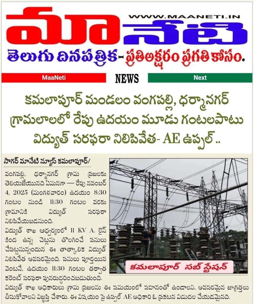 కమలాపూర్ మండలం వంగపల్లి, ధర్మానగర్ గ్రామలాలలో రేపు ఉదయం మూడు గంటలపాటు విద్యుత్ సరఫరా నిలిపివేత- AE ఉప్పల్..