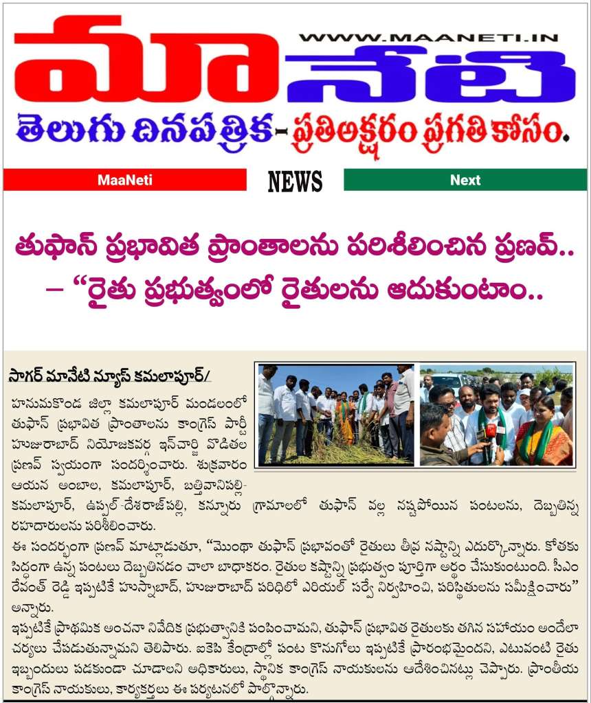 తుఫాన్ ప్రభావిత ప్రాంతాలను పరిశీలించిన ప్రణవ్– “రైతు ప్రభుత్వంలో రైతులను ఆదుకుంటాం..